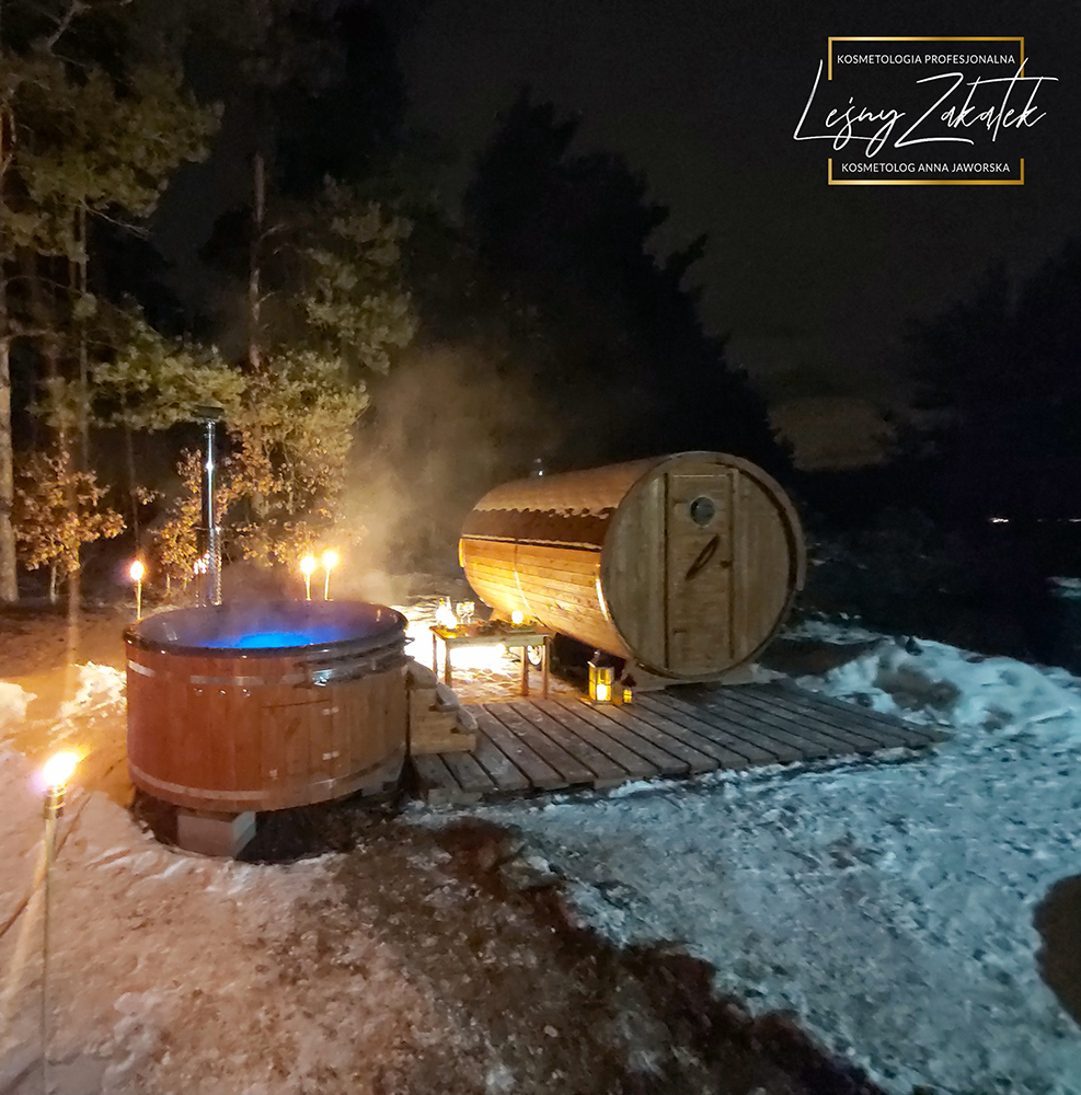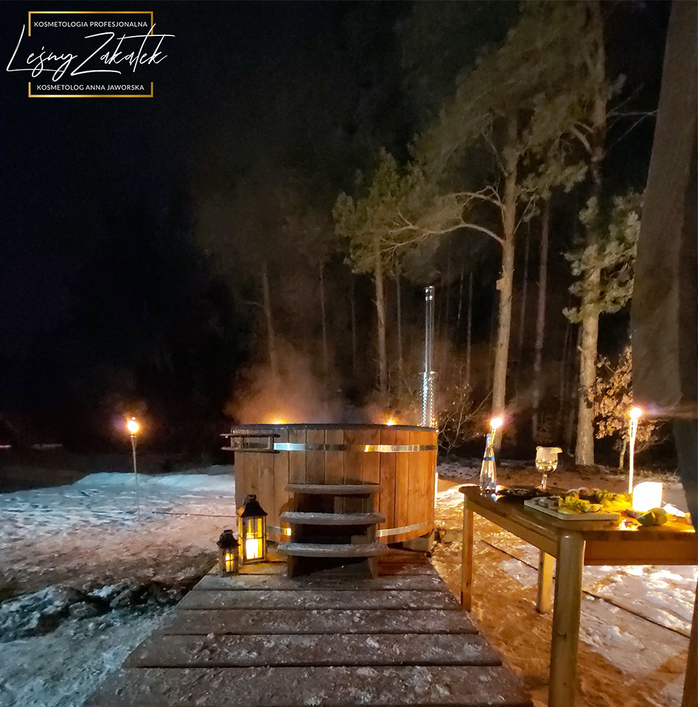 Kąpiel w wannie z hydromasażem i widokiem na otaczający las to atrakcyjna forma spędzenia czasu i antidotum na stres cywilizacyjny.